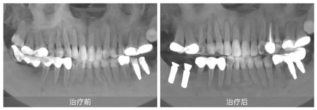 她自小牙齿不好,早年正牙过程中不幸遭遇正畸片切不当导致下颌右侧两颗磨牙严重受损,之后未经正规处理直接拔牙,造成重要磨牙缺失,严重影响咀嚼功能。随后原治疗机构采用倾斜智齿制作了不良烤瓷长桥修复,导致前磨牙牙髓坏死造成根尖炎。雪上加霜的是,五年前又被某口腔机构蹩脚医生把上颌两侧磨牙做了不必要的牙冠,之后下颌左侧两颗磨牙也因种植体位置不正导致牙冠频繁脱落,种植体也有折断风险。
