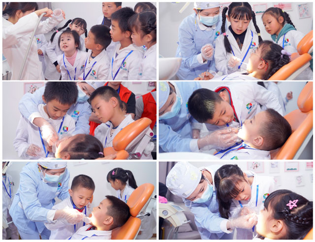 随后,小牙医们来到新桥口腔儿童早期矫正专科诊室,认识了可以喷水、喷气、喷雾的三用枪,以及吸唾装置等口腔治疗最常用的器械。之后大家两两分组,亲身体验牙医工作,在医务人员的指导下,为同伴们进行了牙齿的初步检查。