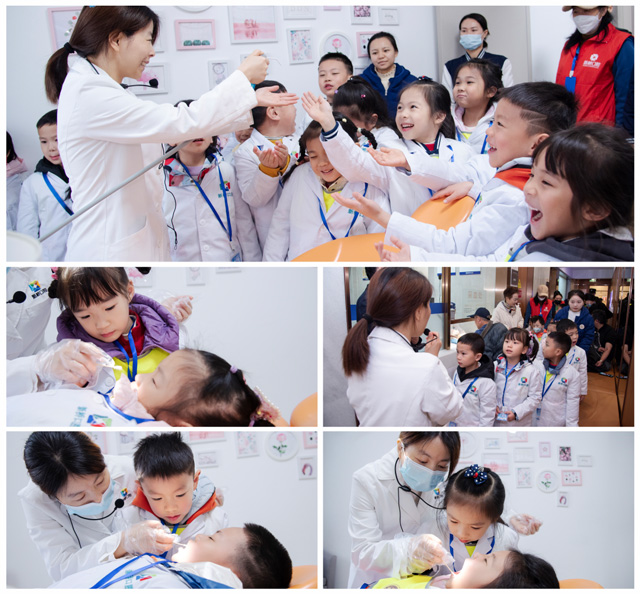 随后,在工作人员的带领下,孩子们还参观了新桥口腔医院。此外,大家还亲身体验了一把当牙医的感觉——穿上专门定制的白大褂,模拟牙医诊疗过程,通过给小伙伴儿检查牙齿,亲身感受牙医的工作日常。