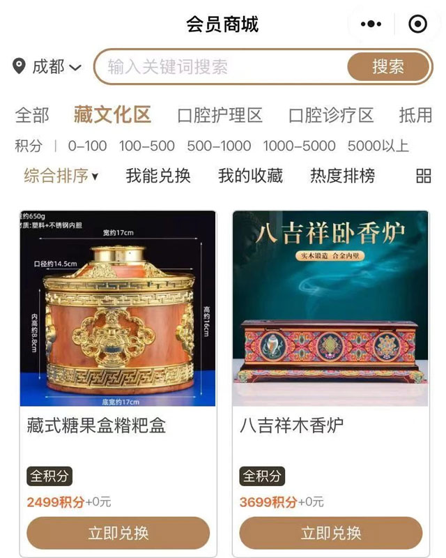 12月,也是新桥口腔一年一度的岁末口福节。本月会员中心积分商城全新上线“藏文化区”,新桥口腔会员可在此凭积分兑换具有藏族文化特色的精美礼品,在呵护口腔健康的同时,领略藏文化的独特魅力。