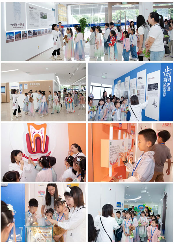当天上午,小朋友们身着各式汉服翩然而至,女孩们的襦裙随风轻舞,男孩们的长衫儒雅大方,宛如从古画中走出的“小精灵”,成为现场最亮眼的风景线。在新桥口腔工作人员的带领下,大家一同参观了新桥口腔成都总院,每每走到一处,便吸引不少候诊顾客驻足观看。