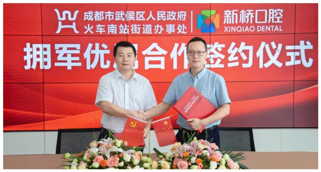 为积极响应“鼓励企业、社会组织等社会各界为持证人提供多元化优待服务”及“丰富服务内涵、创新服务项目、扩大服务范围”的政策号召,6月19日,新桥口腔成都总院(成都人南新桥口腔医院)与成都市武侯区人民政府火车南站街道办事处举行拥军优属合作签约仪式。双方就共建共享退役军人“服务超市”及优待证赋能建设达成深度合作,以实际行动践行社会责任,为退役军人及其他优抚对象提供优质口腔医疗服务。