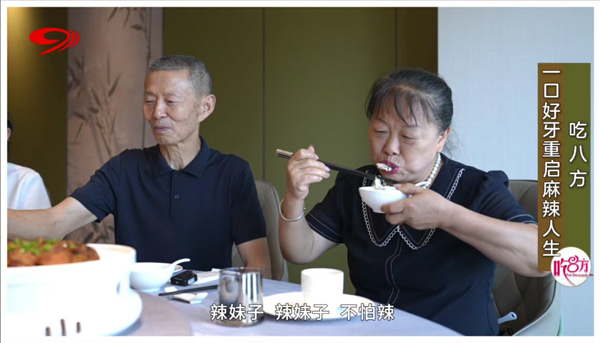 第一道挑战是融合川、湘两地特色的剁椒鱼头,鲜辣浓郁的酱汁淋面,入口则需经受鲜辣与骨刺的双重挑战。面对这道菜,王阿姨表示牙口不好时只有看的份,而在新桥口腔种好下半口牙以后,王阿姨如今也能大饱口福并笑着说道:“现在辣的也可以吃了,硬的也可以吃了。”