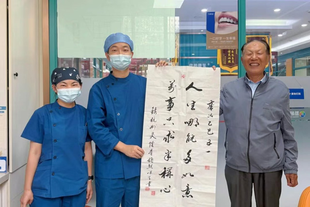 日前,新桥口腔西宁院区种植专业组副主任黄清川收到了一幅墨香四溢的书法作品。作者李秋成叔叔今年84岁,是新桥口腔西宁院区的一位“种牙回头客”。