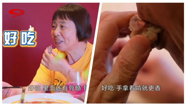 第二道关卡是以秘制卤水腌制、经烘烤风干而成的秘制风干骨。咸鲜入味的肉质遍布硬骨之上,只有牙口好才能啃得香。在新桥口腔种好全口牙的赵阿姨在品味后说道:“好吃,里面还有骨髓。”而同样种了满口好牙的吴叔叔则直接上手啃得过瘾:“好吃,手拿着啃就更香。”
