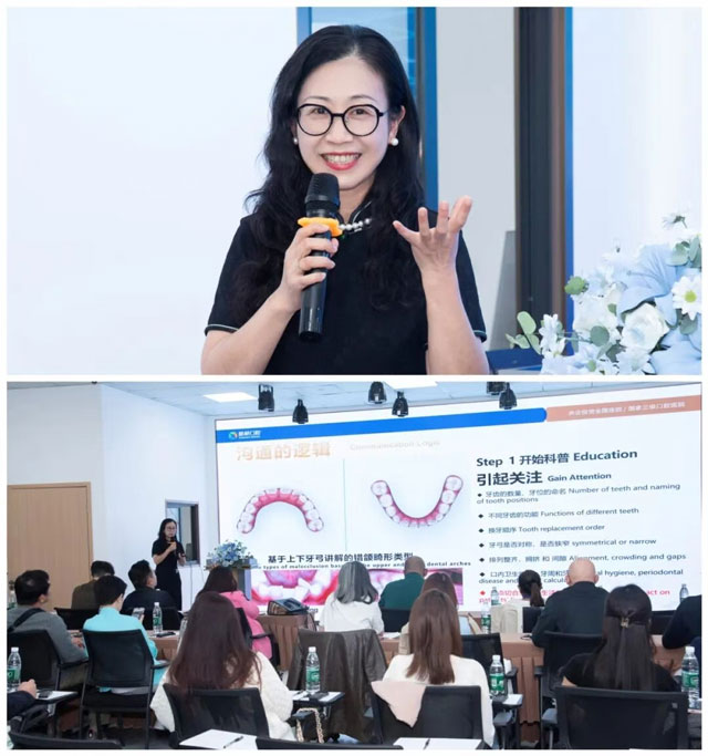 “面诊与方案沟通最重要的一点在于‘认知的同频’,只有让患者清晰理解诊疗对生活的影响,才能建立深度信任。”刘姗院长介绍,新桥口腔特别引入iTero数字化平台,通过3D模拟影像直观展示正畸全流程,使患者得以“预见”正畸效果,让医患站在“同视角”沟通正畸方案,极大提升了沟通效率与信任基础。同时,刘姗院长还分享了隐适美高效正畸案例,通过对比患者正畸前后的真实变化,直观展现了数字化技术在隐形正畸中的优势,引发在场专家的热烈讨论。