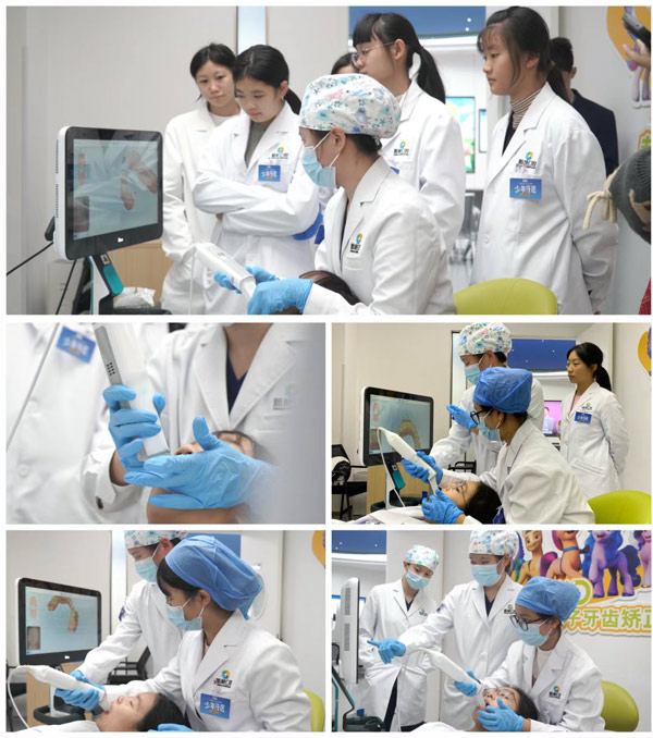 在口腔3D建模岗位模拟中,新桥口腔医护人员首先向同学们详细介绍并现场演示了3D数码口腔扫描仪的使用方法以及快速高效采集口腔模型的技巧要领。然后,同学们两两分为一组,亲身为同伴进行口腔扫描,口扫仪屏幕上清晰呈现其口内详细情况。针对同学们不同的牙齿症状,医护人员现场详细做了告知,并给予了具体的、个性化的护齿建议。