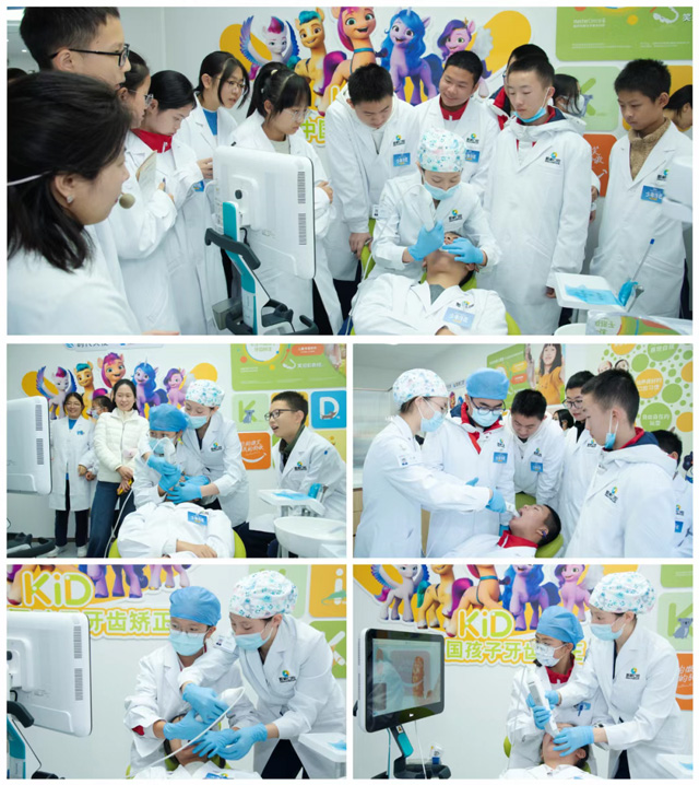 在医护人员的指导下,“医生”们戴好口罩、帽子、手套…..一切准备就绪后正式开始。通过短短几分钟的扫描,屏幕上即刻呈现“顾客”清晰的口腔三维立体图像,龋齿、牙结石、色素等口腔状况一目了然。这项高科技体验让同学们连连惊叹,直呼这台口扫仪太神奇!