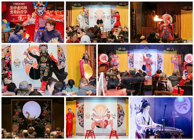起霸、趟马、耍花枪,刀马旦身段惊艳全场,唱念做打间演绎千年梨园风华,尽显非遗戏曲的风雅韵致。《古筝》《手影》《水袖舞》,则以极致视听体验彰显出中华传统艺术的东方才情。《滚灯》《茶艺》《变脸吐火》,刚柔相济、雅俗共赏的川味绝艺,尽展非遗蜀韵的独特风情,更令人惊叹于巴蜀文化的瑰丽奇绝。