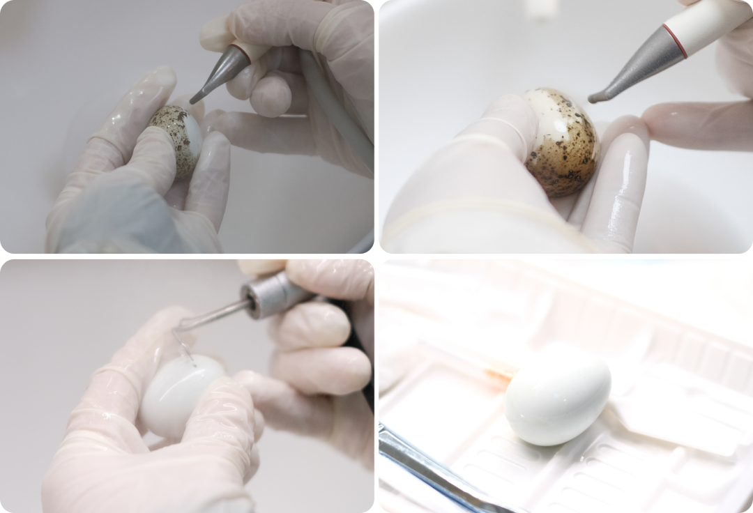 本次技能PK赛,就是要通过对鹌鹑蛋喷砂除色壳不破,考核洁牙师应对各种外源性牙色问题的处理技巧;通过声波除壳膜不破,考核洁牙师整体手法与稳定的心态。