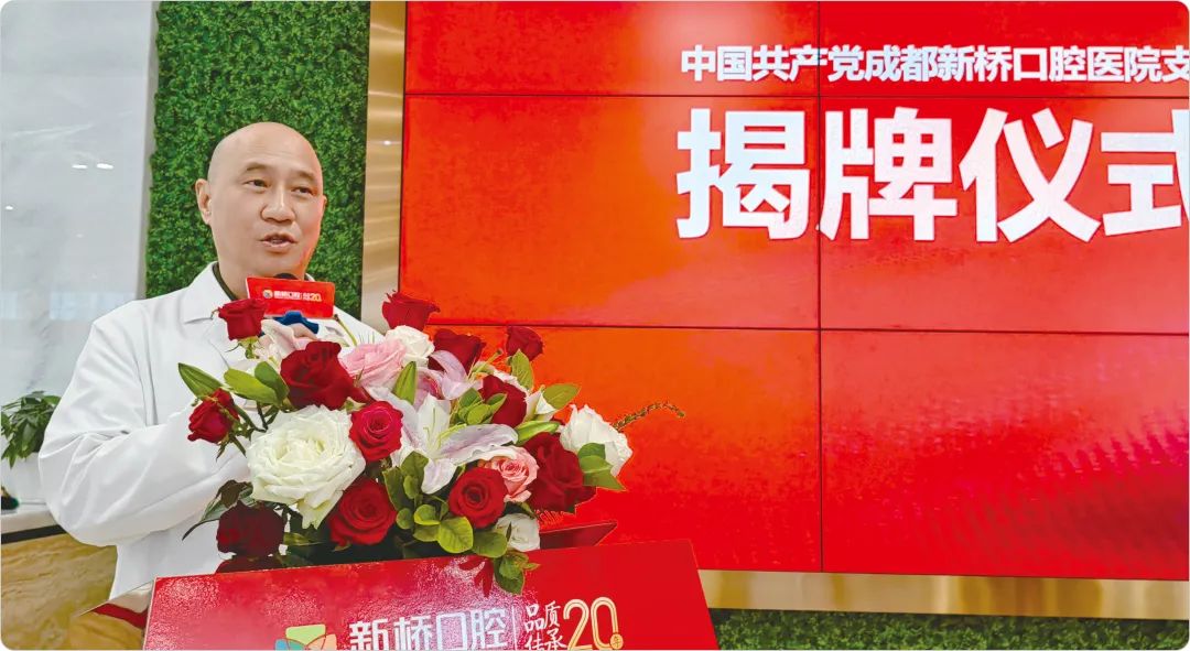 揭牌仪式上,华西种植专家/新桥口腔成都玉双院区业务院长刘果生代表新桥口腔,向莅临现场的领导介绍了新桥口腔的发展历程、学科建设、团队建设和开展的慈善公益等情况。