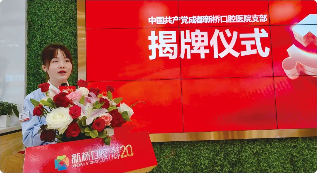 身为一名护士,蒋越表示在护士节当天被正式宣布当选新桥口腔第一届党支部书记,是自己人生中极具纪念意义的“巧合”。而她与华西种植专家/新桥口腔成都玉双院区业务院长刘果生的同台则更加令人感慨。一位是年近七旬的中国种植先驱,以40多年深耕厚植,引领中国口腔种植事业走向繁荣;一位是充满朝气的“新旗手”,以青春的活力,书写奋斗与担当!这一跨越50载的同台,是新桥口腔“新老”两代人的坚守与接力,也彰显了新桥口腔始终如一,传承华西品质与红色精神的双重内核!
