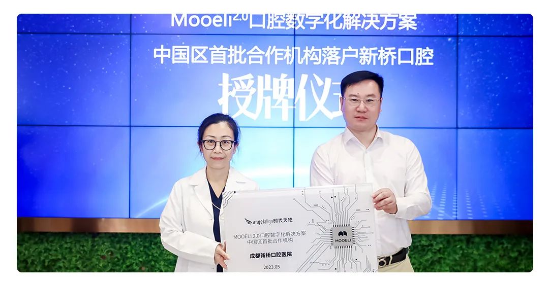 仪式现场,经中国隐形正畸品牌时代天使指定授牌,Mooeli2.0口腔数字化解决方案中国区首批合作机构正式落户新桥口腔。