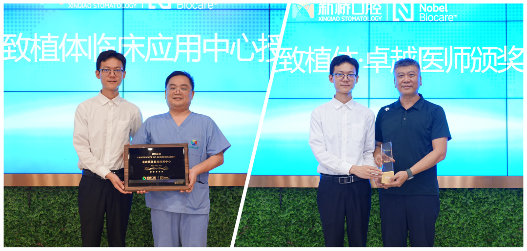 交流会现场,诺保科西区区域市场部主管钱蒙山还带来了两大“惊喜”——为新桥口腔颁发“NOBEL金致植体临床应用中心”授牌,为新桥口腔种植医生张凯颁发“NOBEL金致植体·卓越医师”奖杯。