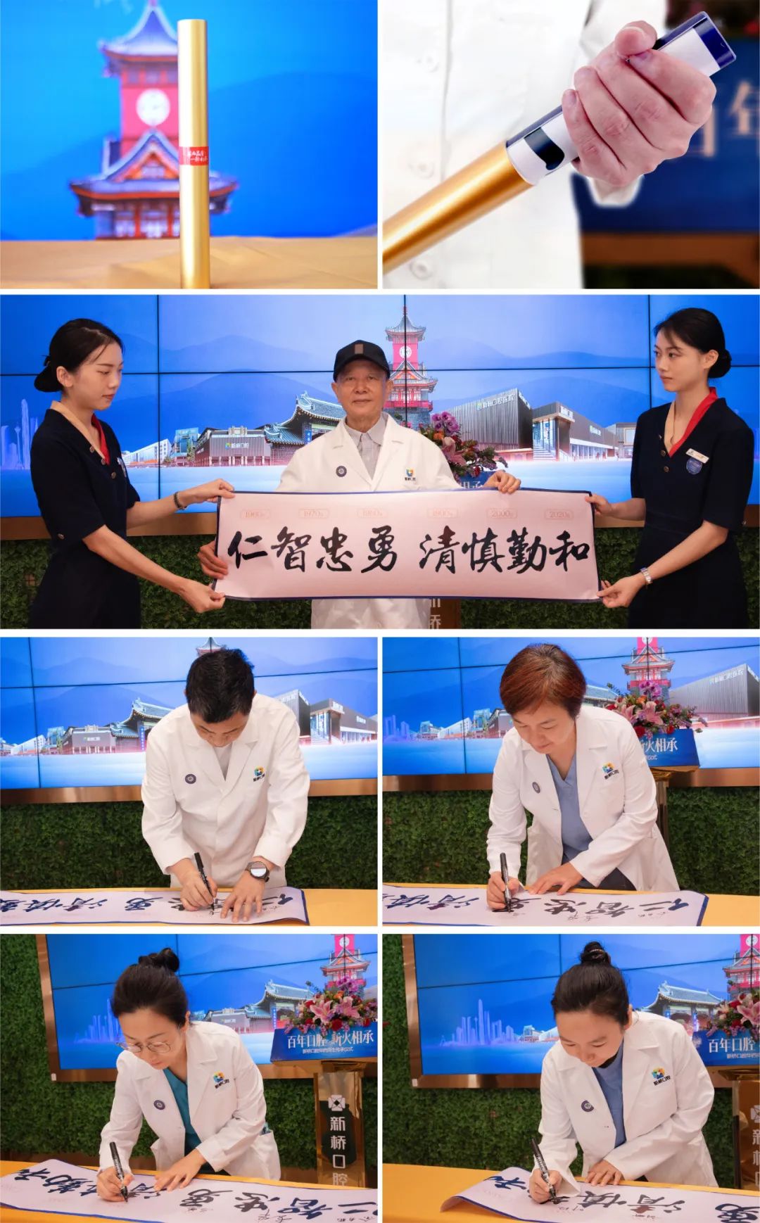 “仁智忠勇 清慎勤和” 书写着华西校训的卷轴从接力棒中取出,在传承仪式上缓缓展开,由余自能教授开始,四代受教于同一所口腔圣地,怀揣着同一个医学梦想,奋斗于同一处前沿阵地的新桥口腔华西师生们,庄严地留下了自己的学级和姓名,也留下了他们孜孜不倦,为口腔医学事业传递薪火,护航万千微笑的医者仁心和师者圣心。