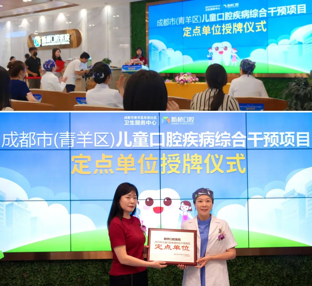 为降低成都市儿童乳牙及恒牙龋病患病率,提高全市儿童的口腔健康水平,2023年成都市(青羊区)儿童口腔疾病综合干预项目也于日前启动。成都市青羊区东坡社区卫生服务中心主任胡雪飞、副主任白开悦代表项目亲临现场,为新桥口腔颁发“定点单位”授牌。新桥口腔儿童早期矫正专科主任周媛媛、新桥口腔成都光华院区门诊主任李晓玲出席了仪式。