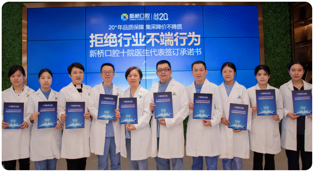 在王旭东主任的带领下,新桥口腔十院医生代表现场签署了《拒绝行业不端行为 高品质集采种牙承诺书》,从材料品质、医生实力、服务水平、远期效果四个层面,保障集采种牙降价不降质,为种植行业正向发展树立标杆。