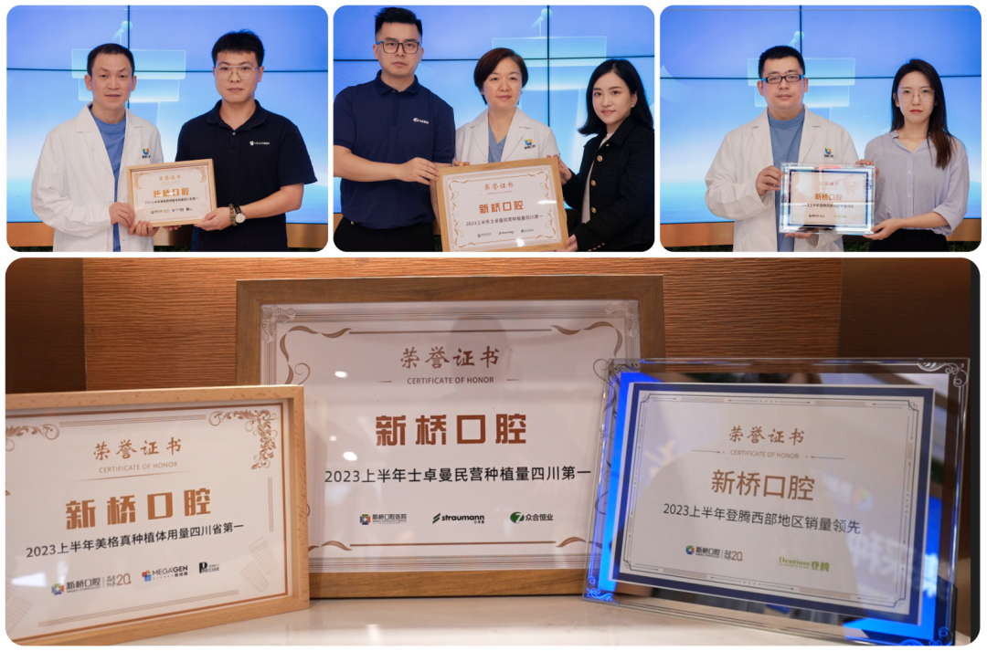 集采160天以来,新桥口腔已接待近两万缺牙患者,为近一万顾客实施种植修复治疗,累计种牙超两万颗。全球知名植体品牌瑞士士卓曼、韩国美格真、韩国登腾在活动现场分别为新桥口腔颁发了“2023年上半年民营种植量四川第一”“2023年上半年种植体用量四川省第一”及“2023年上半年西部地区销量领先”的荣誉奖牌。