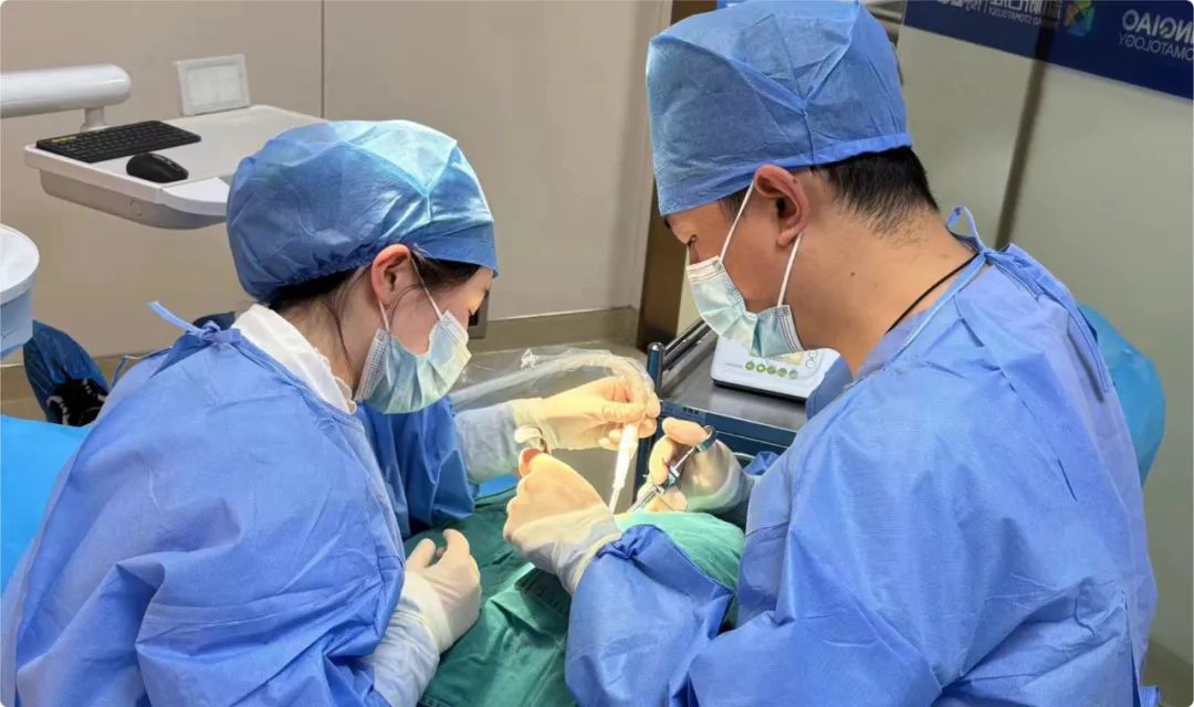 护士一边吸口水一边扶着患者的下巴保持开口度,医助遮住患者的眼睛避免她看到器械害怕,儿子则在一旁安抚。姜辰尽量缩短手术时间,仅用半小时就完成了下半口种植。