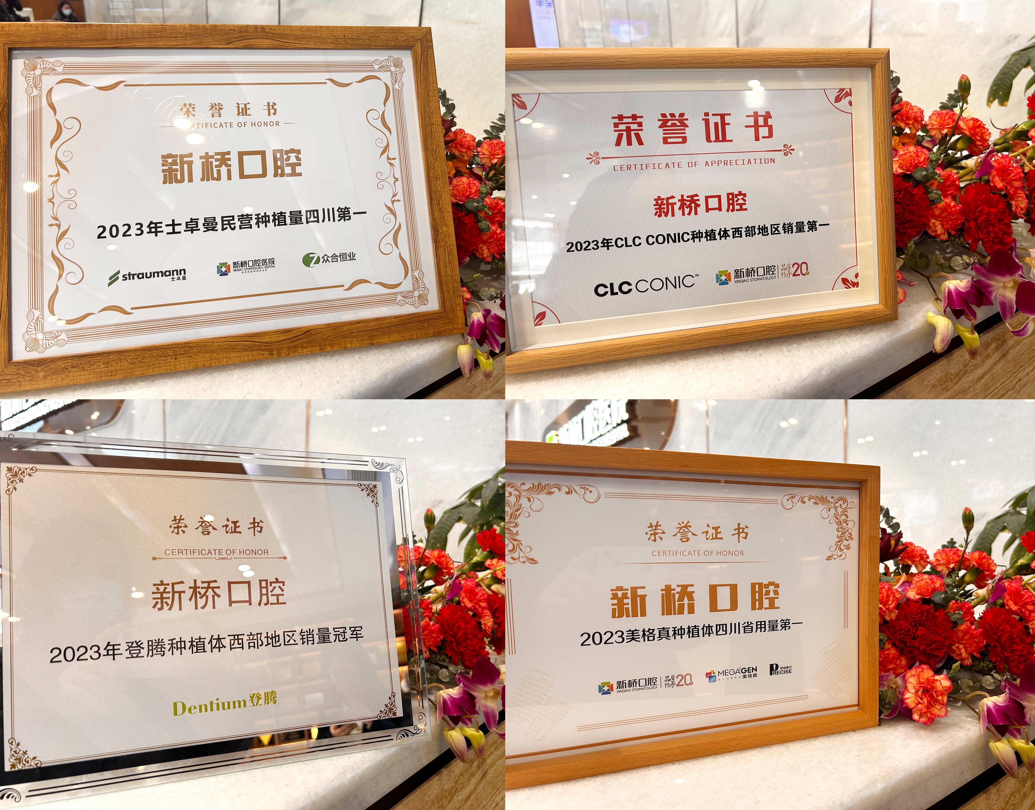 2024年3月15日,新桥口腔先后获全球四大知名种植体品牌——瑞士士卓曼 (TI) 、意大利CLC、韩国登腾(DENTI-UM)、韩国美格真(MEGAGEN)“使用量第一”的荣誉奖牌。