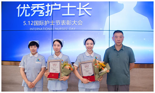 新桥口腔医务中心总监陈晓愚(右一)、护理部主任张熠(左一)为优秀护士颁奖