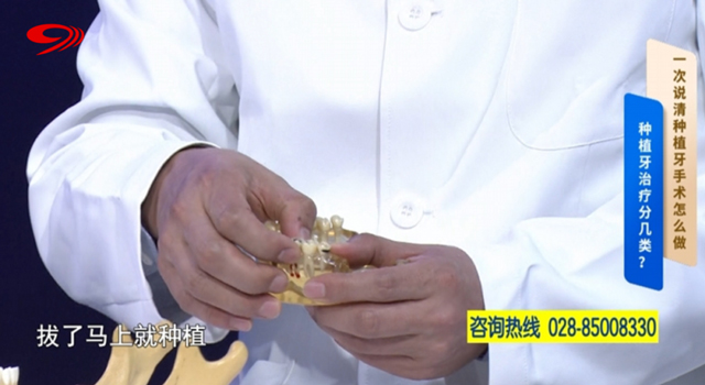 王旭东:这颗牙齿坏了,没有保留价值了,我们拔牙后马上做种植,就叫做即拔即种。因为牙根还在,手术相对复杂一些,要保护软组织(牙龈)。术中先要切开软组织拔出残根,牙根拔出之后要清创,比常规种植多了清创的过程,然后再放入种植体。有个别的还需要填入一定的人工骨粉,相对来说,即拔即种会稍微显得繁琐一些。