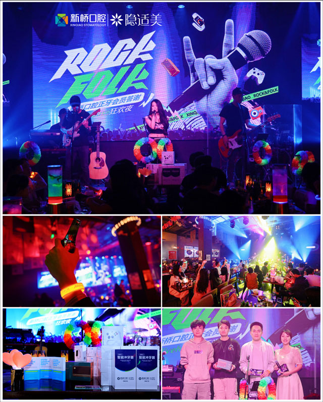 10月12日晚,新桥口腔“ROCK&FOLK live house 狂欢夜”正牙会员答谢活动在成都夜文化地标地九眼桥欢乐上演。新桥口腔隐形正牙会员代表及医生代表齐聚打卡,欢歌小酌笑侃人生,一起共享音乐盛宴!